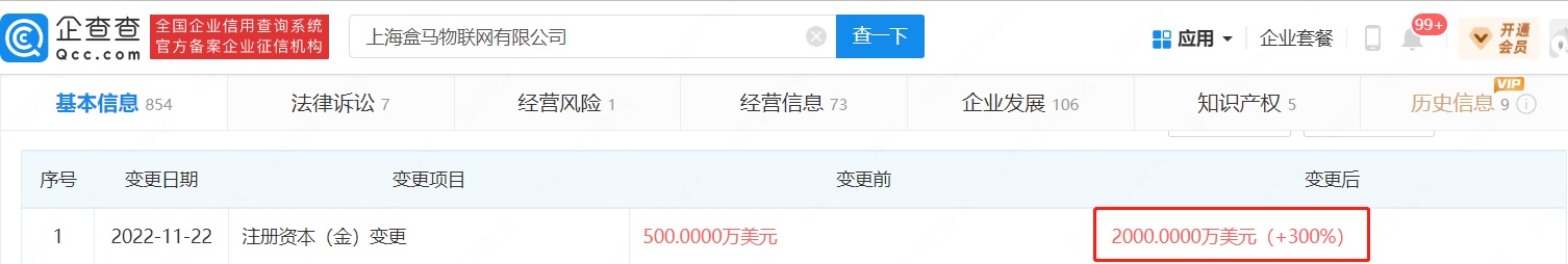 智通财经APP获悉,企查查APP显示,近日,上海盒马物联网有限公司发生工商变更,注册资本由500万美元增至2000万美元,增幅达300%。