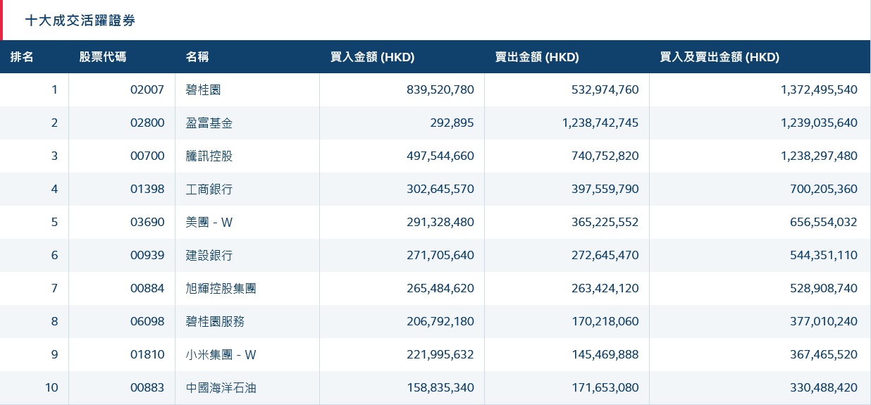 港股通(沪)十大活跃成交股