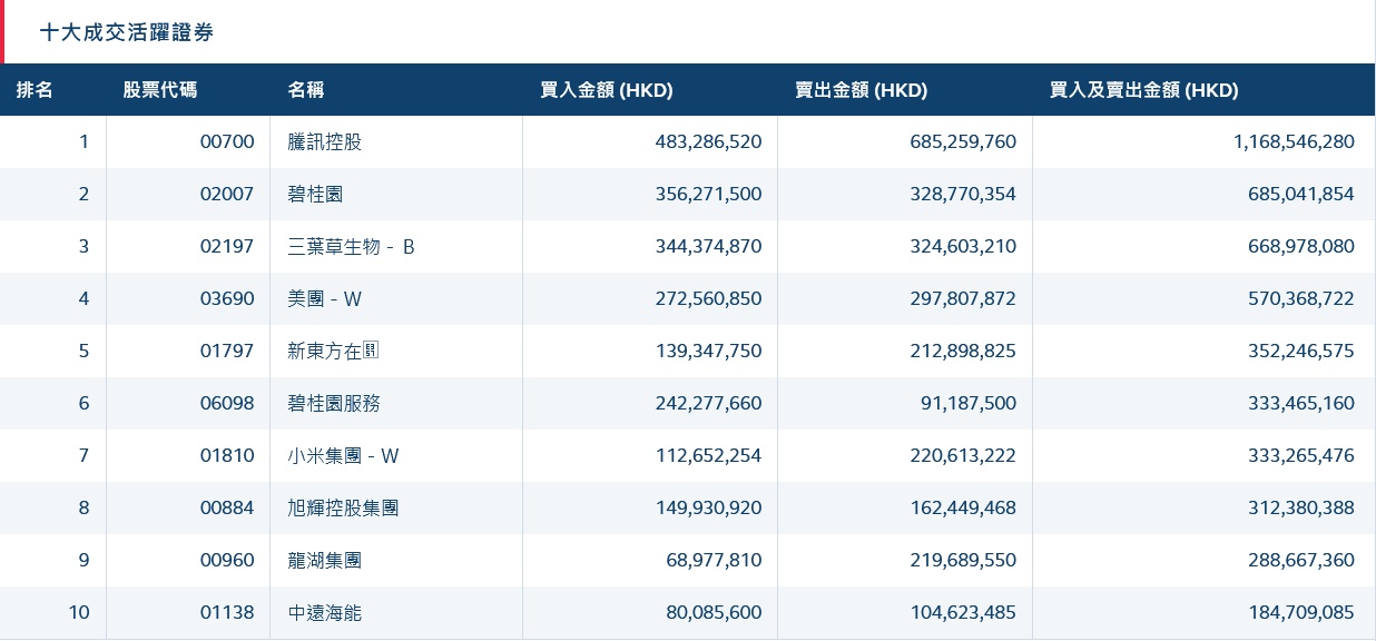 港股通(深)十大活跃成交股