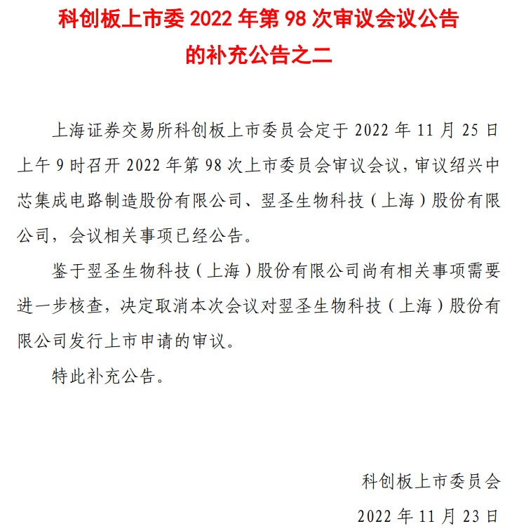智通财经APP获悉,11月23日,上交所公告称,鉴于翌圣生物科技(上海)股份有限公司尚有相关事项需要进一步核查,决定取消科创板上市委2022年第98次审议会议对翌圣生物科技(上海)股份有限公司发行上市申请的审议。公告还提到,翌圣生物原定于11月25日上会。