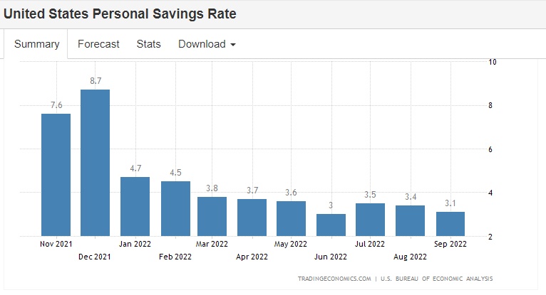 最新的储蓄统计数据显示,美国个人储蓄率从2022年8月的3.40%降至9月的3.10%,市场预计10月也将维持在3.1%低水位附近。