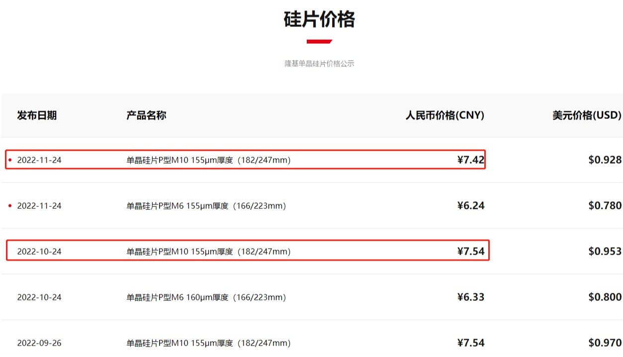 智通财经APP获悉,隆基绿能(601012.SH)于11月24日调整单晶硅片价格,单晶硅片P型M10 155μm厚度(182/247mm)的价格由7.54元下调至7.42元。