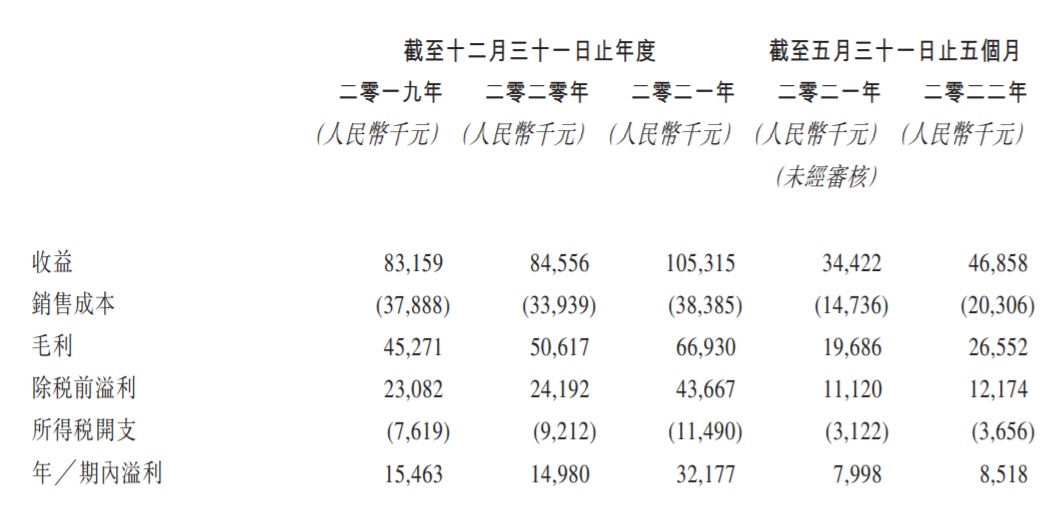 财务方面,于2021、2022年截止5月30日止五个月,公司收入分别为3442.2万元、4685.8万元。公司期内利润分别为799.8万元、851.8万元。