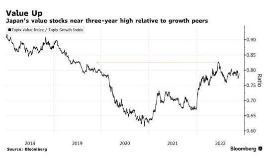Nakayama表示,随着基本面改善,股市将达到一个转折点,届时资金可能会回流到被低估的工业相关股。Nakayama观察了10至15年的趋势,追踪东证指数(Topix)股票的指标显示,相对于成长型股票,价值型股票目前处于近三年来的高点。
