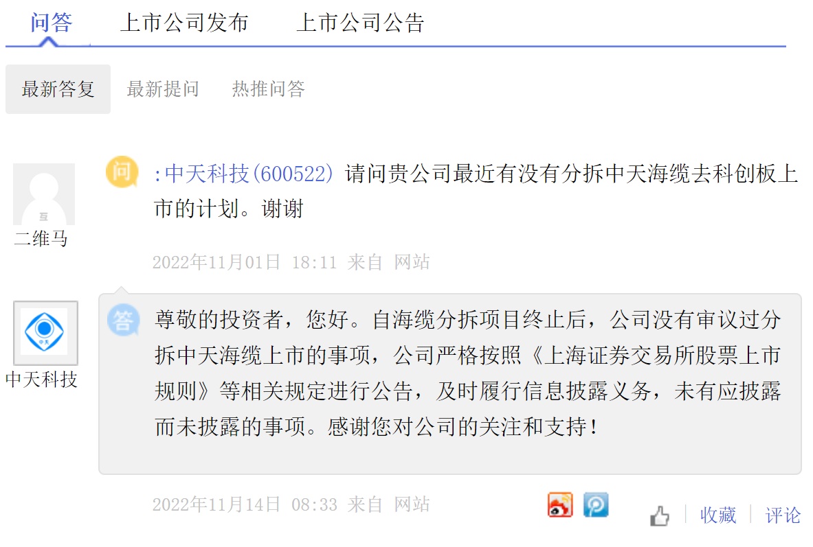 值得注意的是,就在11月14日,中天科技在投资者问答环节称没这个打算的。