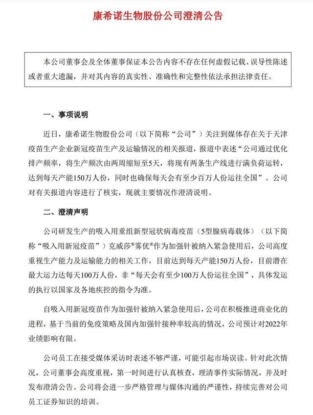 康希诺称,自吸入用新冠疫苗作为加强针被纳入紧急使用后,公司在积极推进商业化的进程,基于当前的免疫策略及国内加强针接种率较高的情况,预计对2022年业绩影响有限。康希诺还补充道,公司员工在接受媒体采访时表述不够严谨,可能引起市场误读。