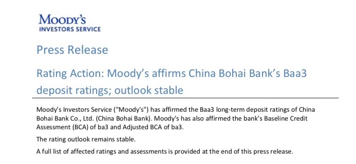 近日,享誉全球的国际权威评级机构——穆迪投资者服务公司(Moody’s Investors Service,以下简称“穆迪”) 发布报告,确认渤海银行股份有限公司(以下简称“渤海银行”)Baa3的长期存款评级,同时维持渤海银行主体信用评级为投资级评级,展望稳定。