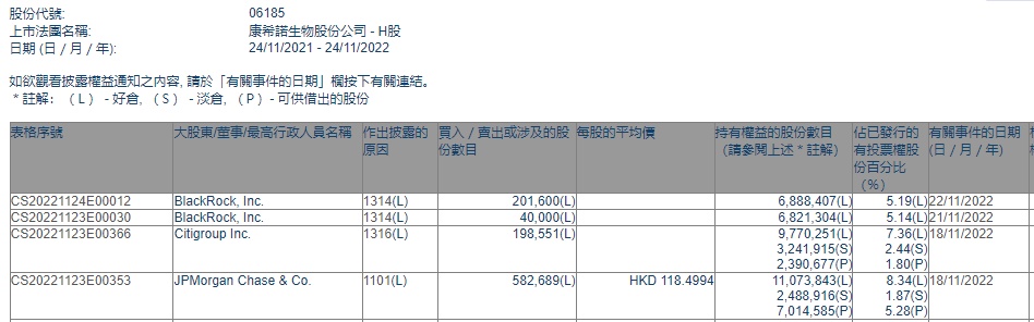 智通财经APP获悉,香港联交所最新资料显示,11月18日,小摩增持康希诺生物(06185)58.2689万股,每股作价118.4994港元,总金额约为6904.83万港元。增持后最新持股数目约为1107.38万股,最新持股比例为8.34%。