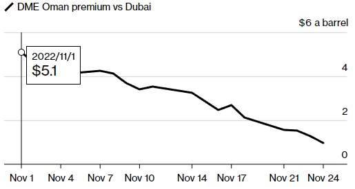 智通财经APP获悉,周四,迪拜商品交易所(DME)阿曼原油期货价格较迪拜原油掉期的溢价于本月下跌了约80%,跌破1美元/每桶。而亚洲原油消费指标--阿曼原油期货价格对迪拜掉期的溢价现已降至近七个月的低点。全球能源指标变化正不断对未来石油市场的需求担忧发出警告。