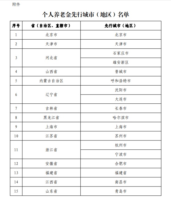 为贯彻落实《国务院办公厅关于推动个人养老金发展的意见》(国办发〔2022〕7号),根据《人力资源社会保障部 财政部 国家税务总局关于报送个人养老金先行城市的通知》(人社部函〔2022〕62号)要求,在各省(自治区、直辖市)申报的基础上,经研究,确定了个人养老金先行城市(地区)名单,现予以公布。自本通知印发之日起,在先行城市(地区)所在地参加职工基本养老保险或城乡居民基本养老保险的劳动者,可参加个人养老金。