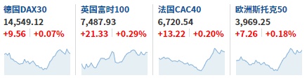 2. 截至发稿,德国DAX指数涨0.07%,英国富时100指数涨0.29%,法国CAC40指数涨0.20%,欧洲斯托克50指数涨0.18%。