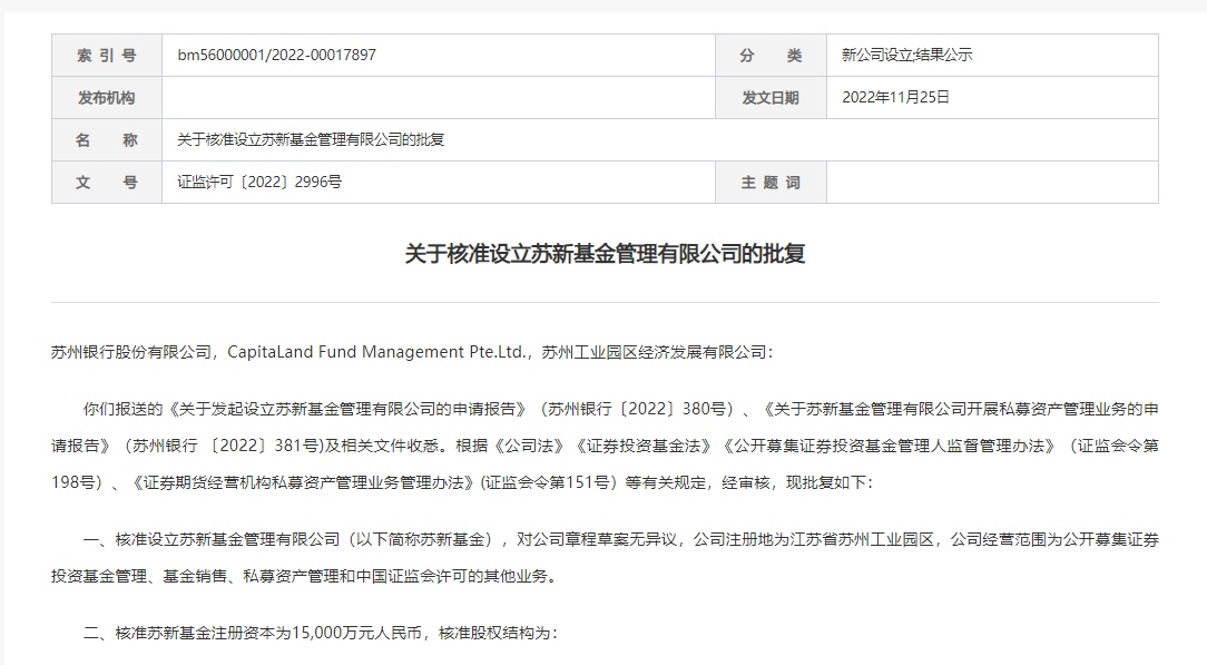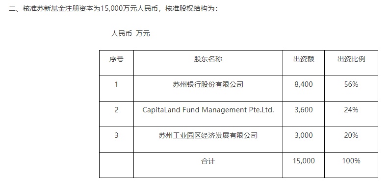 从股权结构来看,三大股东分别为苏州银行股份有限公司、CapitaLand Fund Management Pte.Ltd.、苏州工业园区经济发展有限公司,出资比例分别为56%、24%、20%。