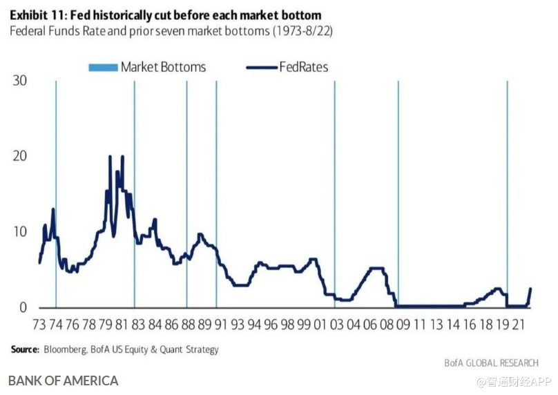 由美国银行分析师制作的一张图表在今年已多次出现在人们面前。这张图表显示,在过去70年里,美股在美联储降息之前往往不会触底。