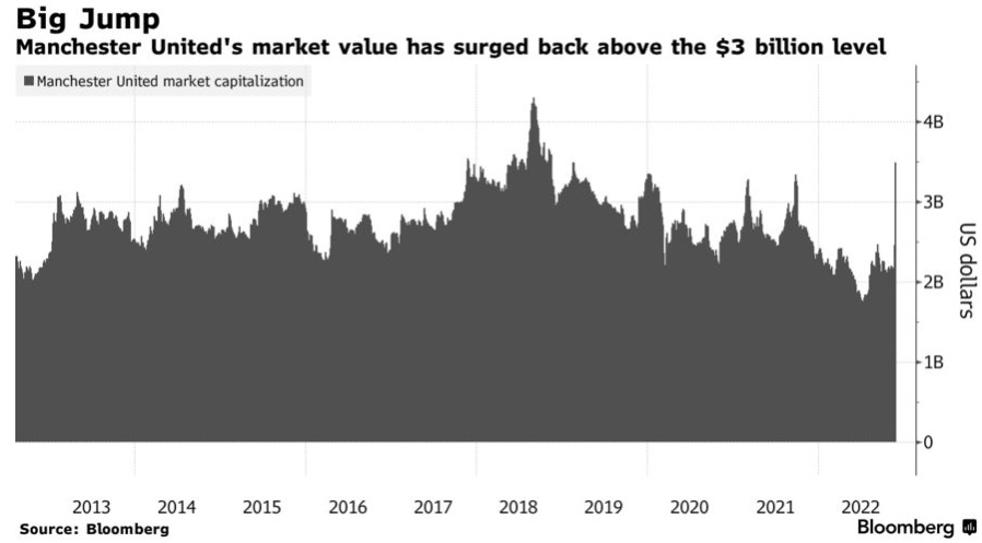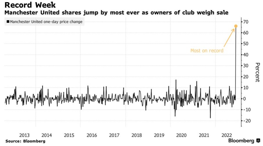 从著名球星克里斯蒂亚诺·罗纳尔多(C罗)的离开,到全球最大足球俱乐部之一可能被出售的消息,这家在美国上市的英国体育公司的股票一直处于疯狂状态。在截至11月25日的一周内,该股一度飙涨逾68%,截至周五收盘,该股累计上涨62%,市值增加约13亿美元,创下2019年2月以来的最高水平。