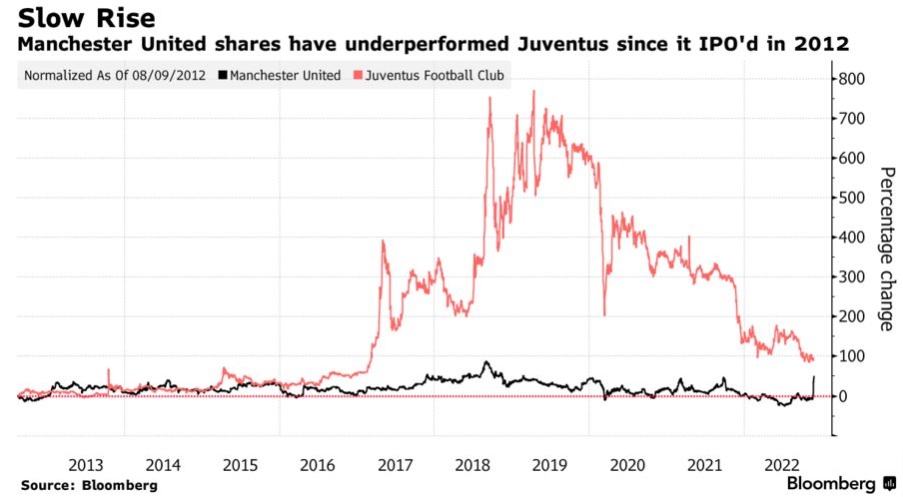 这一表现也与欧洲足球巨头尤文图斯足球俱乐部形成鲜明对比。同期,尤文图斯在意大利股市上市的股票回报率超过了90%。即使经过本周大涨,曼联自IPO以来仅上涨了约52%,依然落后于美国和欧洲股市的基准指标。