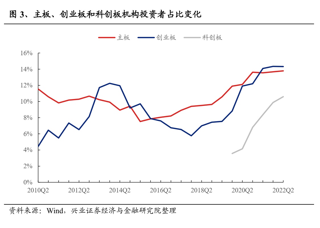 但对比主板和创业板,科创板机构化程度仍有提升空间。截至今年2季度,主板、创业板和科创板中的机构投资者占比分别为13.8%、14.3%、10.6%,科创板的机构化程度与主板和创业板仍有3%-4%左右的差距。