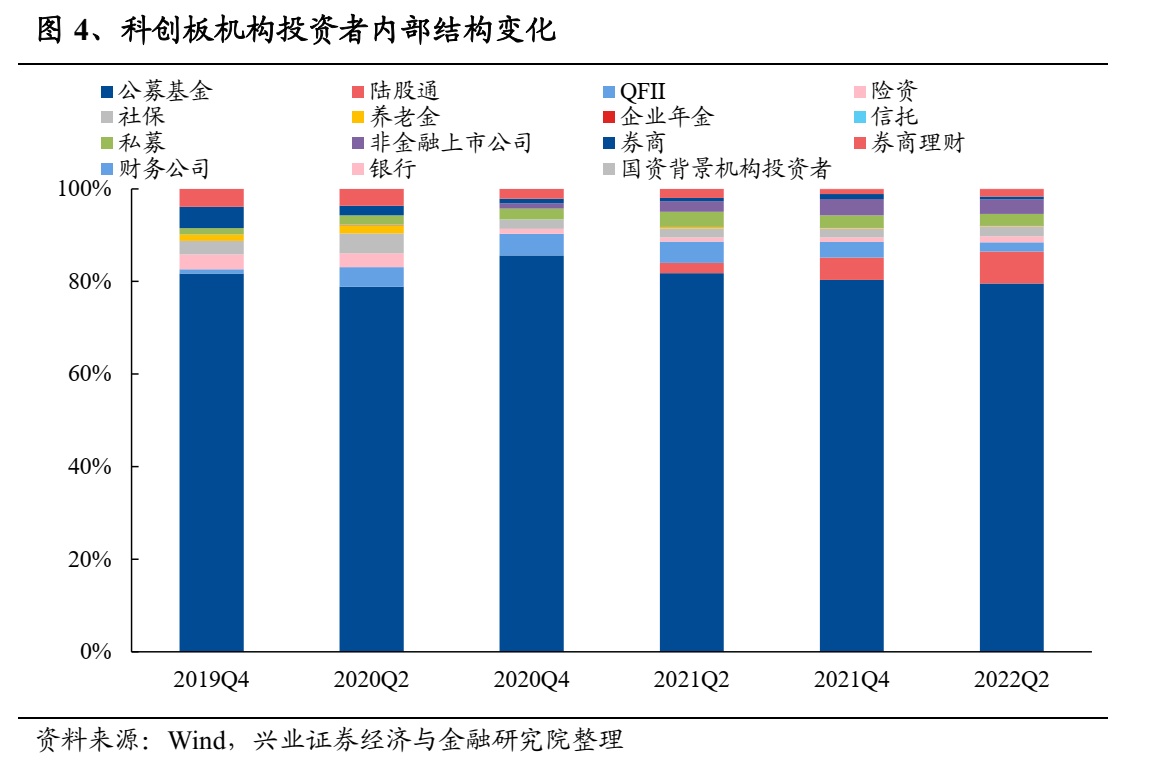 科创板机构投资者持股市值占比快速上行。截至2022Q2,机构投资者总计持有科创板标的市值为5718.29亿元,占板块A股总市值的比重为10.60%,较2021Q4提升0.73pct,较2019年底提升7.03pct。