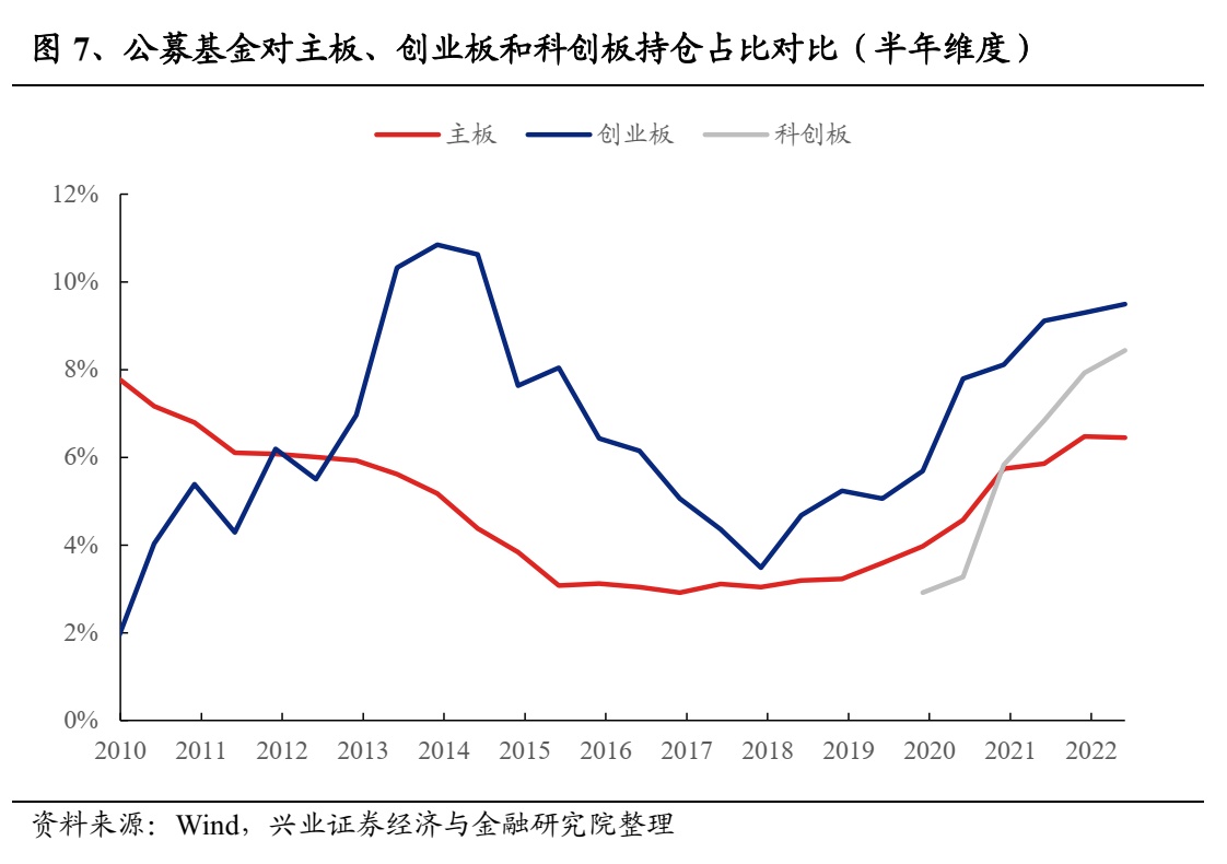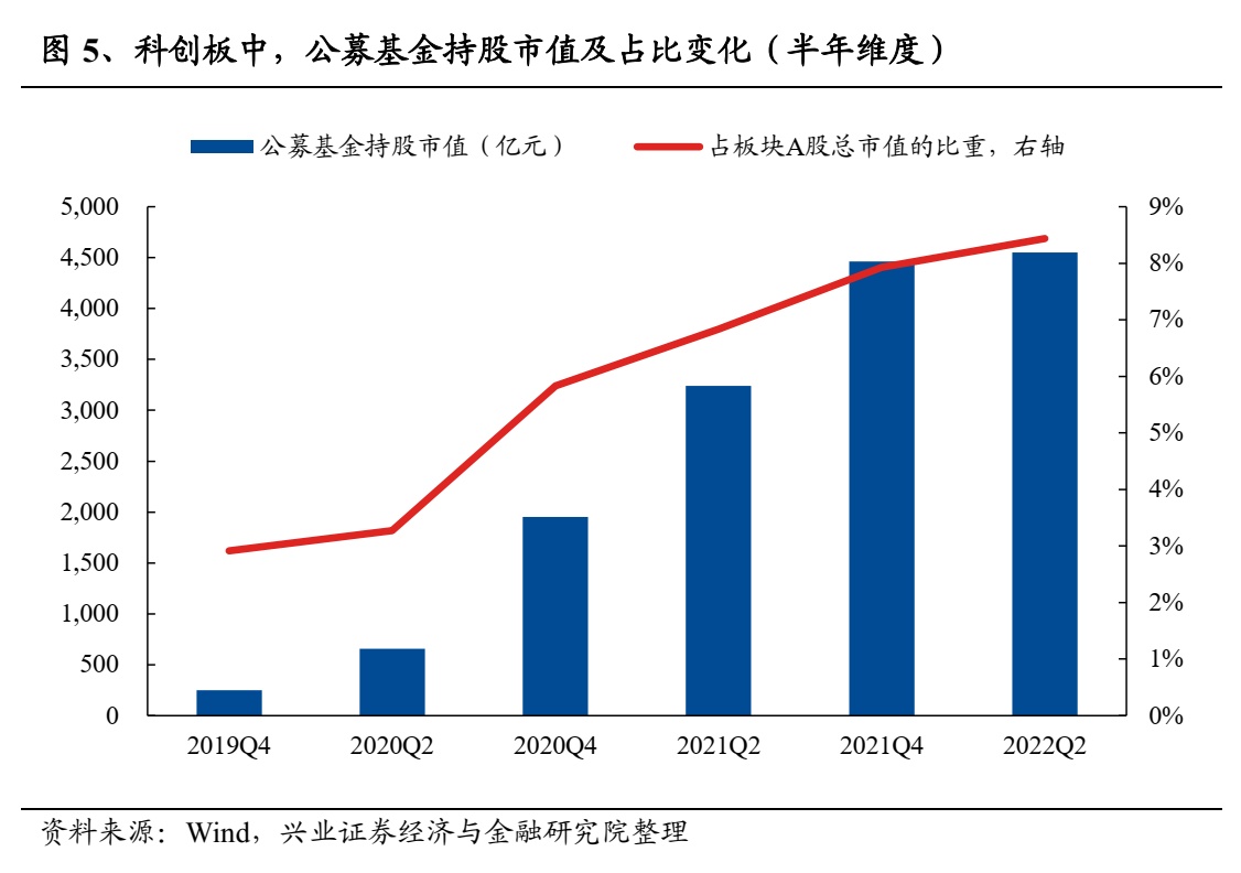 2.1、公募:第一大机构投资者,定价权稳步提升2019年底以来,公募基金对科创板定价权稳步提升。截至2022Q2,公募基金持有科创板股票市值占板块A股总市值的比重为8.44%,相比2021年底上涨0.51pct。