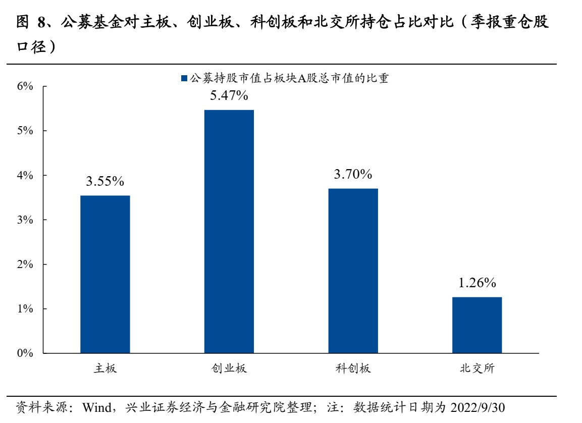 公募在科创板中的持仓占比高于主板,但低于创业板。(1)半年维度全口径下,公募基金对科创板的持仓占比提升速度最快,2019Q4-2022Q2,占比由2.91%上升5.52pct至8.44%,但仍低于创业板的9.49%。(2)季报十大重仓股口径下,当前公募在科创板中的持股占比高于主板和北交所,但较创业板仍有1.76pct的差距。