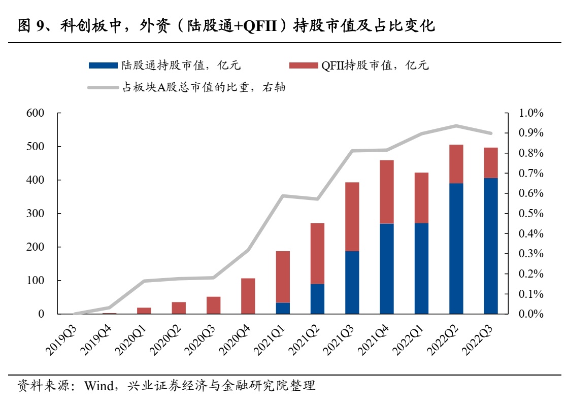 2.2、外资:占比趋于稳定,但仍有增长空间外资在科创板占比快速提升后趋于稳定。自2021年2月1日科创板股票纳入沪股通股票池以来,北上资金快速布局科创板,截至2022Q3,陆股通科创板持股市值快速升至405.94亿元,带动外资持仓占比提升至22Q3的0.9%。