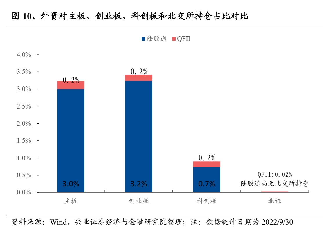 外资在科创板的定价权弱于主板和创业板。相比于主板和创业板,尽管QFII在三类板块中的持仓占比较为一致,但北上资金在科创板的持股市值占比显著偏低。