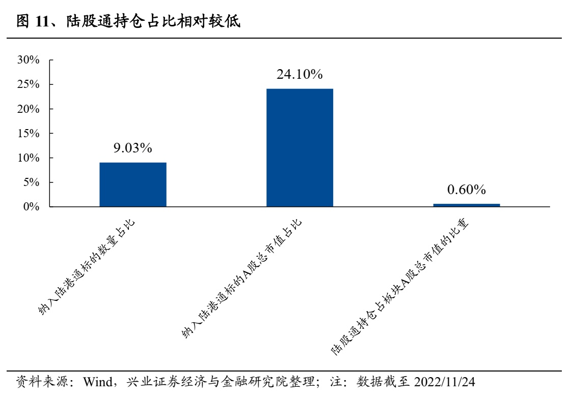 外资持仓占比具有提升空间。截至2022/11/24,仅有44只科创板股票被纳入陆港通标的池,占科创板公司数量的9%,占板块A股总市值的比重为24.1%,远高于当前北上资金持股市值占比。因此,北上资金在科创板的占比仍有提升空间。