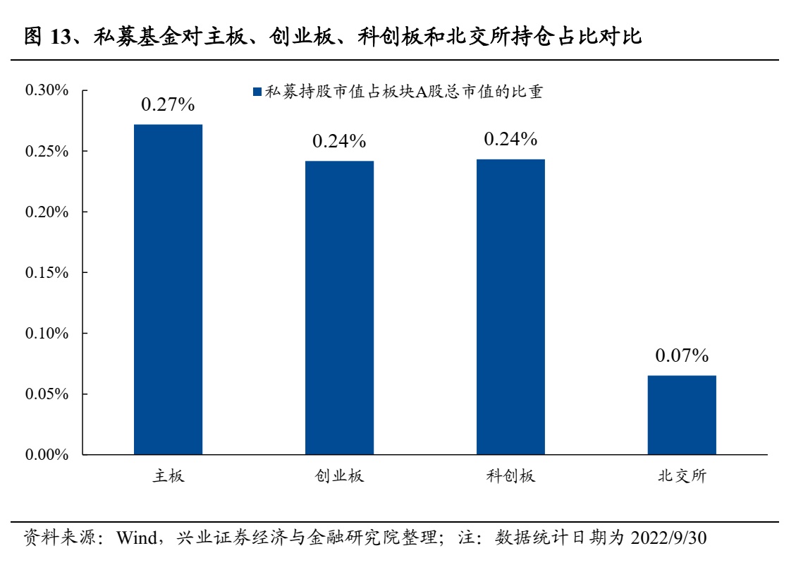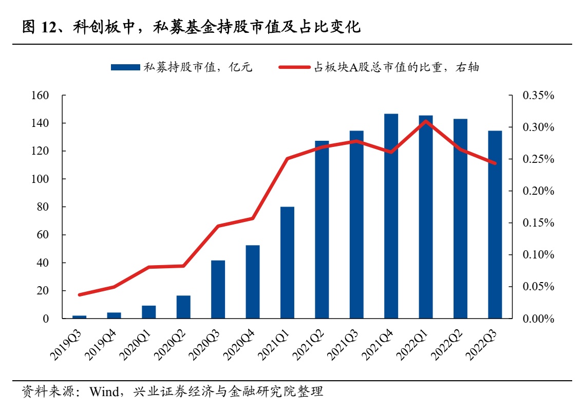 私募在科创板的持仓占比接近创业板和主板的水平。截至2022Q3,私募持股市值占科创板总市值的比重为0.24%,与其创业板的持仓水平相当,略低于主板的0.27%。