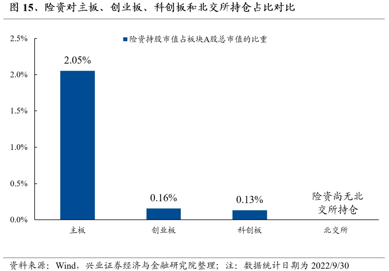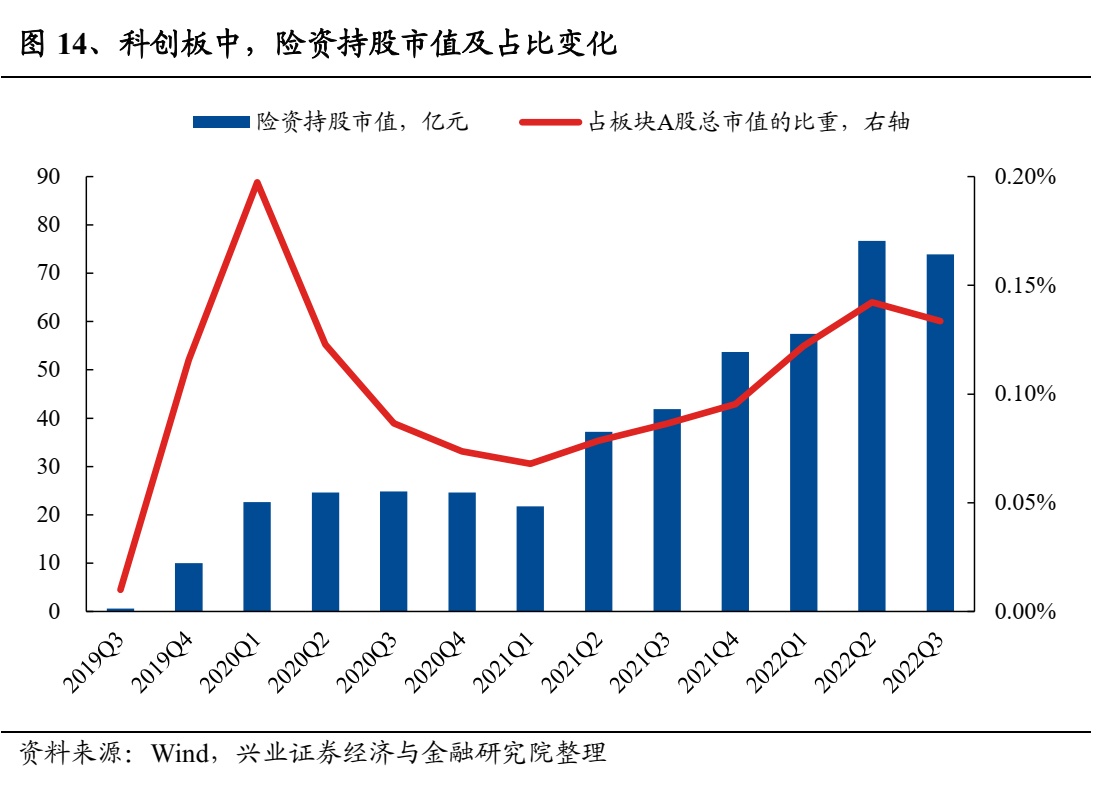 险资对科创板配置仍有较大的提升空间。截至2022Q3,险资在科创板中的持股市值占科创板A股总市值的比重为0.13%,远低于主板的2.05%,与创业板持仓水平较为接近。