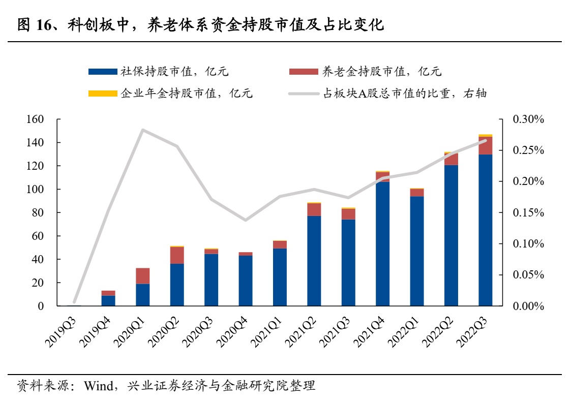 科创板开板以来,养老体系资金的持仓占比呈震荡上升趋势。截至2022Q3,养老体系资金(社保基金+基本养老金+企业年金)持有的科创板股票的总市值由2019Q3的0.36亿元大幅提升至146.94亿元,占板块A股总市值的比重由0.01%上行至0.27%。拆分来看,社保基金贡献了主要增量,其持股市值增长近360倍。