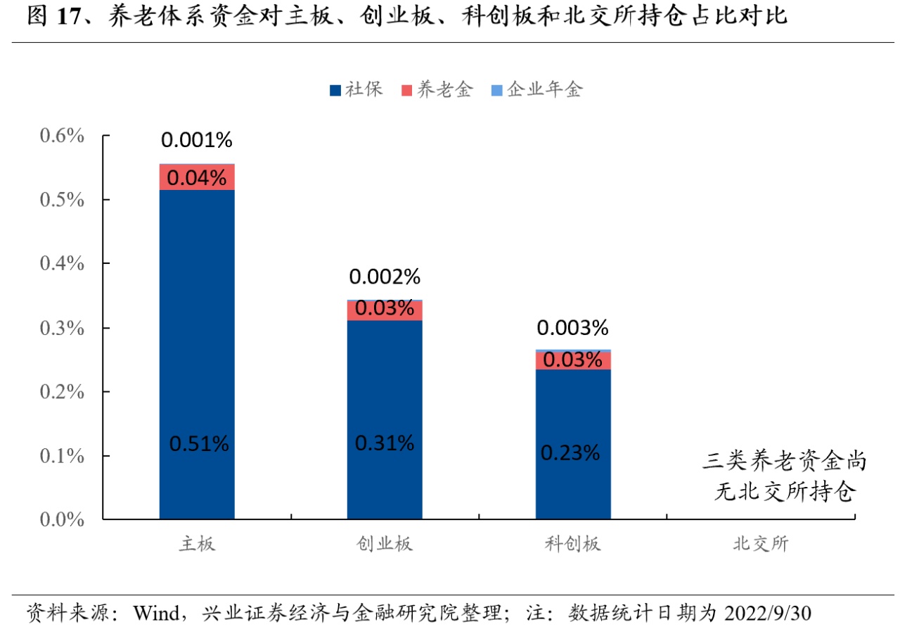 相比于主板和创业板,社保基金持仓占比有较大提升空间。截至2022Q3,社保、养老金和企业年金在科创板中的持股市值占科创板A股总市值的比重分别为0.23%、0.03%、0.003%,三者合计为0.27%,低于主板和创业板。其中,社保基金持仓占比明显低于主板的0.51%和创业板的0.31%,仍有较大的提升空间。
