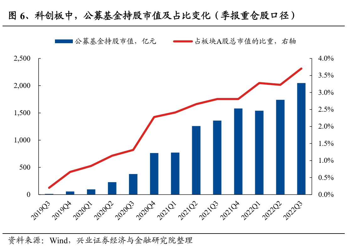 从十大重仓股口径来看,公募基金科创板持股市值和占比更是连续12个季度上行。截至2022年三季度末,根据三季报,公募基金持有的科创板标的总市值为2047.84亿元,占板块总市值的比重为3.7%,可比口径下,环比加速上涨0.48pct。