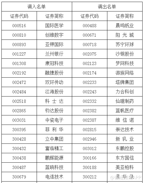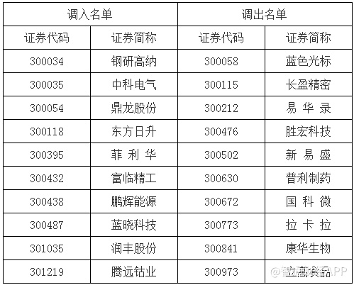 创业板指数调人钢研高纳(300034.SZ)、中科电气(300035.SZ)、鼎龙股份(300054.SZ)等;调出蓝色光标(300058.SZ)、长盈精密(300115.SZ)、易华录(300212.SZ)等。