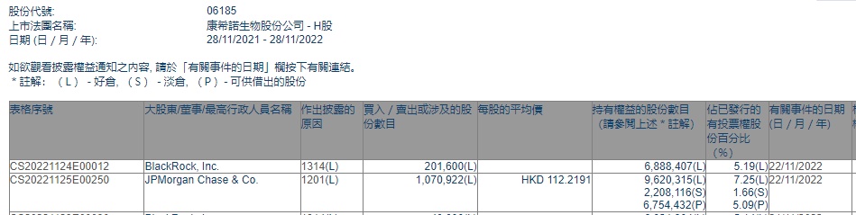 智通财经APP获悉,香港联交所最新资料显示,11月22日,小摩减持康希诺生物(06185)107.0922万股,每股作价112.2191港元,总金额约为1.20亿港元。减持后最新持股数目约为962.03万股,最新持股比例为7.25%。