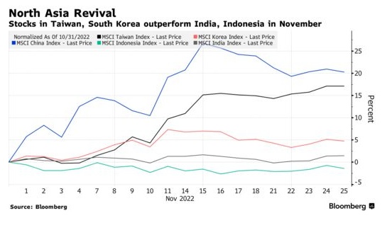 相比之下,曾被投资者视为通胀对冲工具的印尼股市11月走势持平,且有可能出现自去年7月以来的首次月度资金流转为负值。投资者对印度股市的估值也更加谨慎,印度股市的基准指数最近创下历史新高。高盛预计,印度股市在2023年的表现将相对落后。
