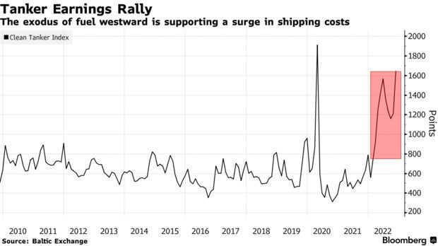 向西方国家供应石油产品需要长途运输,这大幅推高了运输成本,推动了油轮收益的上涨。能源分析公司Vortexa的数据显示,海上燃料运输量较过去五年的平均水平高出3%。Vortexa亚洲首席分析师Serena Huang指出,这主要是由亚洲、中东地区到欧洲的柴油运输造成的。随着欧洲禁止俄罗斯的石油产品供应,亚洲和中东地区的柴油销量可能会进一步扩大。