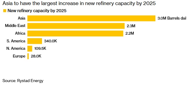 近年来,西方国家大幅削减了炼油产能,而亚洲和中东的炼油产能则在不断扩张,且两者之间的炼油产能差距在俄乌冲突之后进一步扩大。FGE的数据显示,过去三年,包括美洲和欧洲地区在内的西方国家的炼油产能减少了240万桶/日,而亚洲和中东的炼油产能增加了250万桶/日。此外,据Rystad Energy估计,未来三年全球将新增约800万桶/日的炼油产能,其中亚洲新增产能最多,欧洲最少。