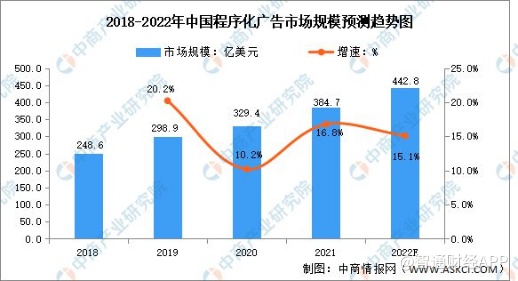 据中商产业研究院数据,2020年中国程序化广告购买市场规模达到329.4亿美元,程序化购买已经成为互联网营销市场的主要方式之一。2022年中国程序化广告市场规模有望达到442.8亿美元。
