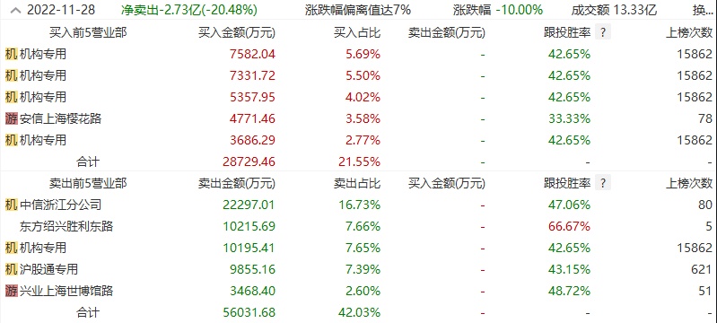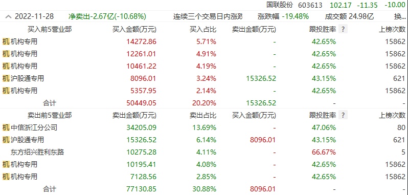 智通财经APP获悉,11月28日,国联股份(603613.SH)今日跌停,报102.17元/股,全天换手率2.62%,成交额13.33亿元。龙虎榜数据显示,机构净买入1.38亿元,沪股通净卖出9855.16万元,营业部席位合计净卖出3.12亿元。国联股份因有价格涨跌幅限制的日收盘价格跌幅偏离值达到7%的前五只证券,非ST、*ST和S证券连续三个交易日内收盘价格跌幅偏离值累计达到20%的证券登上龙虎榜。值得注意的是,此次是近5个交易日内第2次上榜。