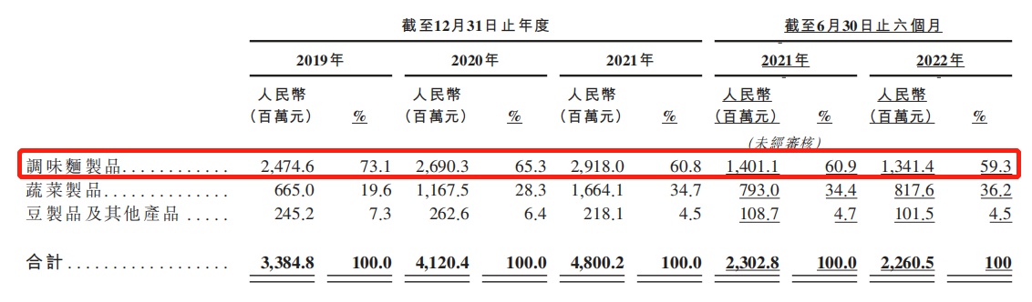 更进一步来看,招股书数据披露,2019年至2022年上半年,卫龙的调味面产品收入分别为24.75亿元、26.90亿元、29.18亿元、13.41亿元,占同期公司总收入的73.1%、65.3%、60.8%、59.3%。虽然占比有所下滑,但近60%的营收占比仍暴露了该公司仍依赖辣条这一主营产品的事实。