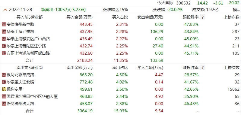 买入方面,安信证券股份有限公司梅州新中路证券营业部、华泰证券股份有限公司上海武定路证券营业部、华泰证券股份有限公司上海静安区广中西路证券营业部、华泰证券股份有限公司上海普陀区江宁路证券营业部、方正证券股份有限公司上海浦东新区成山路证券营业部分别买入443.45万元、437.95万元、436.49万元、432.74万元、432.60万元。