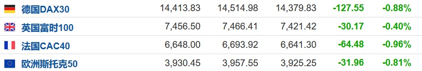 2. 截至发稿,德国DAX指数跌0.88%,英国富时100指数跌0.40%,法国CAC40指数跌0.96%,欧洲斯托克50指数跌0.81%。
