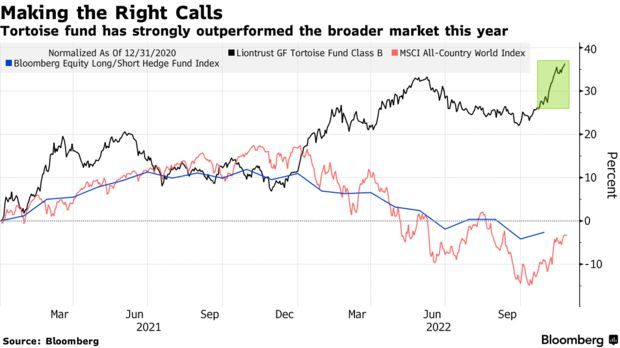 资产管理公司Liontrust GF旗下对冲基金Tortoise被其基金经理Tom Morris描述为“以价值为中心的对冲基金”,该基金规模达6亿美元,寻找其认为便宜的股票。数据显示,该基金今年的回报率达到22%左右,超过了99%的股票多空基金。相比之下,摩根士丹利资本国际全球指数(MSCI All-Country World Index)下跌了17%。
