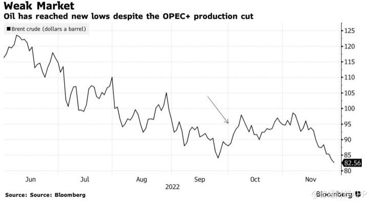沙特及其合作伙伴上个月宣布每天减产200万桶石油,布伦特原油已朝每桶80美元跌去,抹去了今年的涨幅。