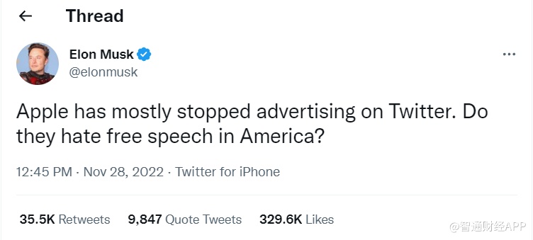 马斯克表示,苹果正在就内容审核要求向推特施压。他在一条推文中写道:“苹果已经基本停止在推特上投放广告。他们讨厌美国的言论自由吗?”