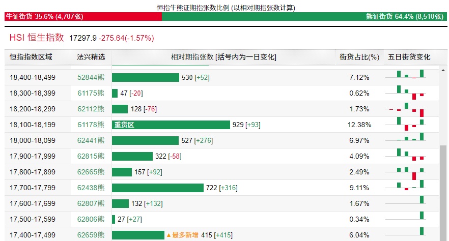 法兴恒指牛熊证街货分布图中的数据显示,熊证街货重货区在18100-18199区间,该区间最新熊证数量为929张,较上一交易日增加93张;最多新增在17400-17499区间,该区间最新熊证数量为415张,较上一交易日增加415张。