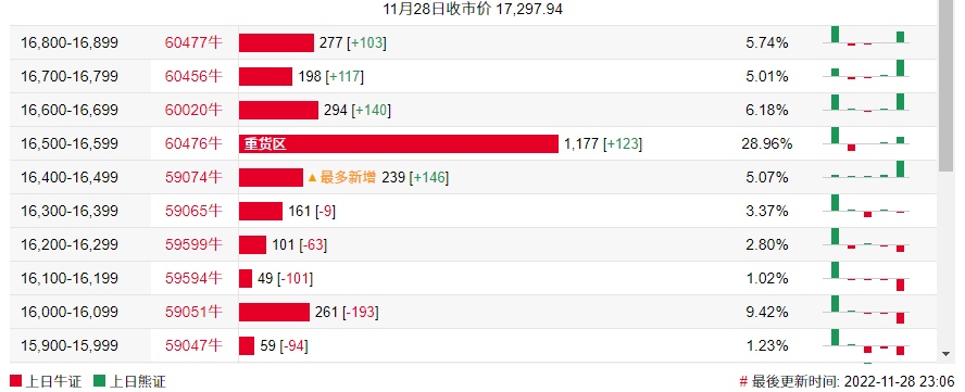 牛证街货重货区在16500-16599区间,该区间最新牛证数量为1177张,较上一交易日增加123张;最多新增在16400-16499区间,该区间最新牛证数量为239张,较上一交易日增加146张。