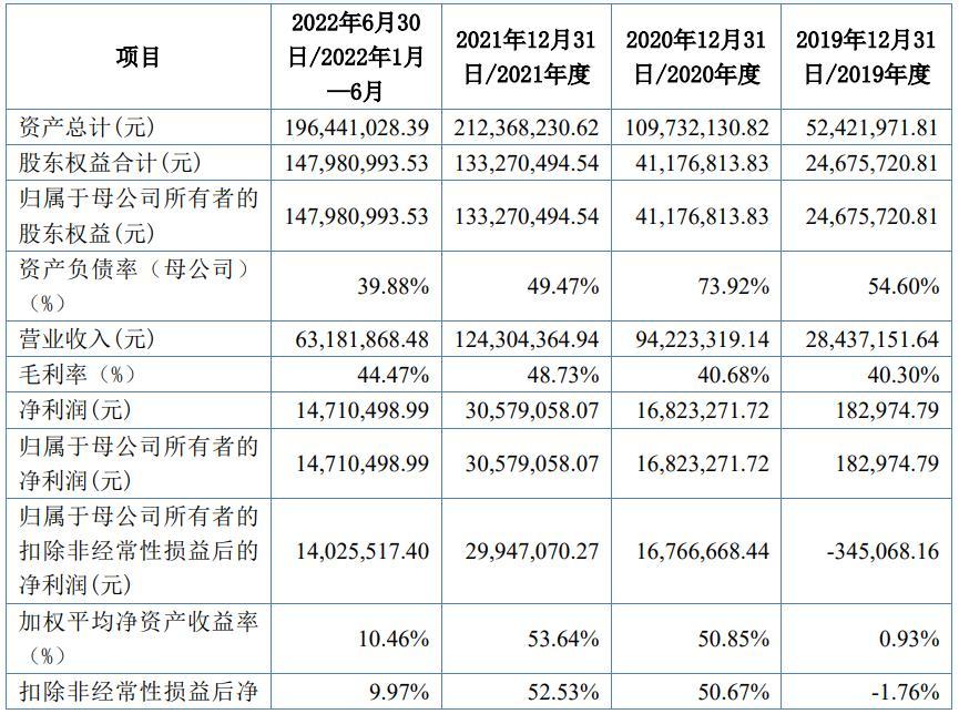 财务方面,2019年度、2020年度、2021年度和2022年1-6月,公司的营业收入分别约为2843.72万元、9422.33万元、1.24亿元和6318.19万元;同期,净利润分别约为18.30万元、1682.32万元、3057.91万元及1471.05万元。
