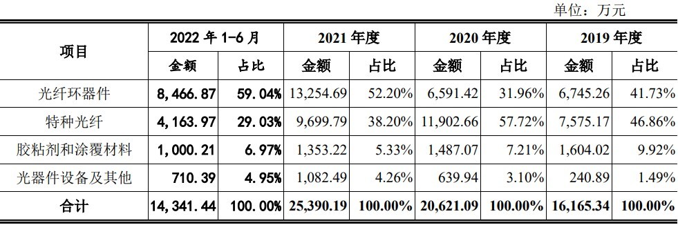在报告期内,公司光纤环器件及特种光纤销售收入占主营业务收入的比例为88.59%、89.68%、90.40%和88.07%,是主营业务收入的主要组成部分。具体情况如下: