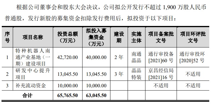 晶品特装表示,据公司董事会和股东大会决议,公司拟公开发行不超过1900万股人民币 普通股,发行新股的募集资金扣除发行费用后,拟投资于以下项目: