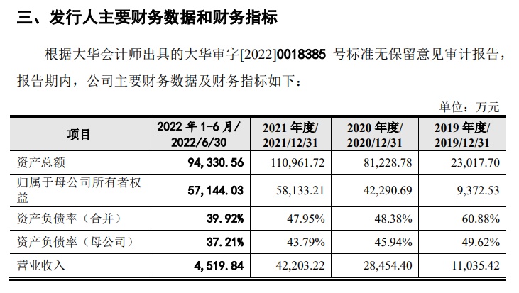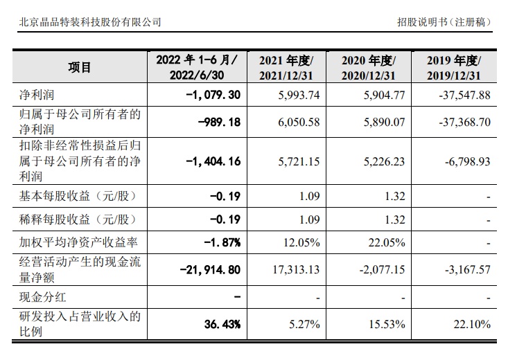 财务方面,2019年、2020年、2021年及2022年上半年,晶品特装营收分别为1.10亿元、2.85亿元、4.22亿元、4519.84万元,归属于母公司的净利润分别为-3.74亿元、5890.07万元、6050.58万元、-989.18万元。公司2021年度营业收入较上年增加约1.37亿元,增幅为48.32%;归属于母公司所有者的净利润较上年增长160.51万元,增幅为2.73%。